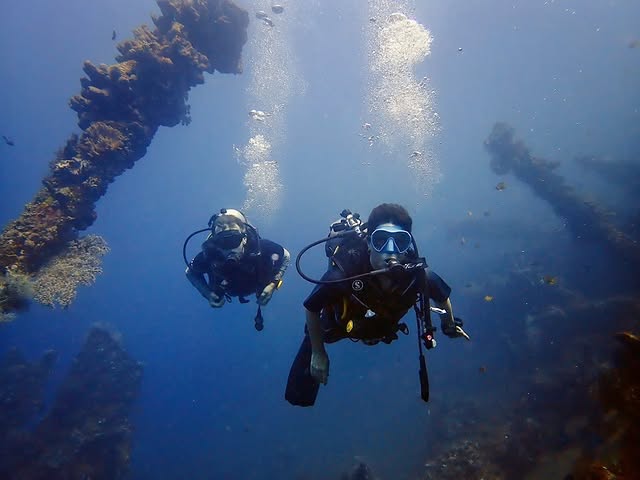 The USAT Liberty ship lies on the bottom of the Tulamben site. It’s a ship that was once used during World War 2 to carry cargo.