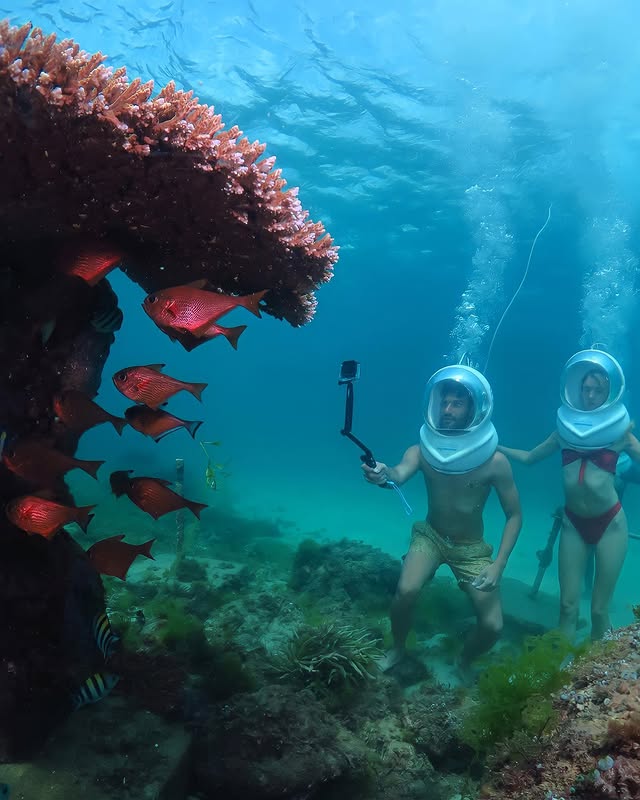 In this activity, you will wear a helmet specially designed for humans to walk underwater. It’s similar to scuba diving, but you won’t dive too deep like one. The Seawalker instructor will take you to the sea floor that is shallow enough to let you walk underwater, which is usually around 20 feet.