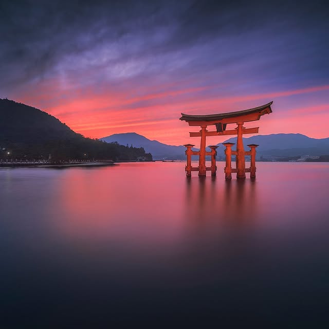 It blossoms with Itsukushima Shrine’s iconic red torii gate in the water.