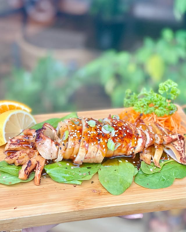Tender, smoky, and slightly chewy. The soy glaze adds a flavourful umami punch, while the natural sweetness of the squid comes through. When miso is used, it has a deeper, richer flavour.