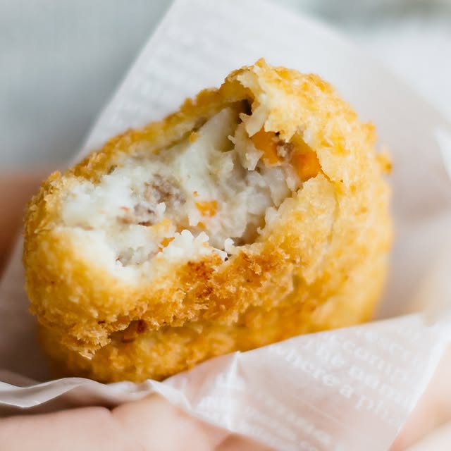 Crispy on the outside, soft and creamy inside. The potato version is mild, savoury, and comforting, while meat or curry versions are richer and more flavourful. Best enjoyed hot with a sprinkle of tonkatsu sauce.