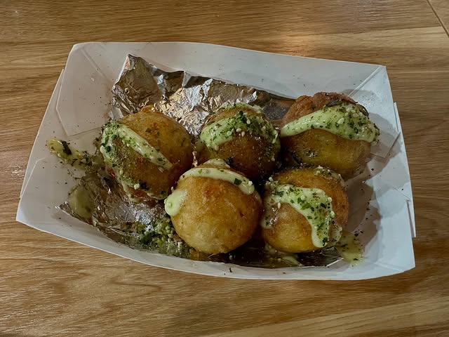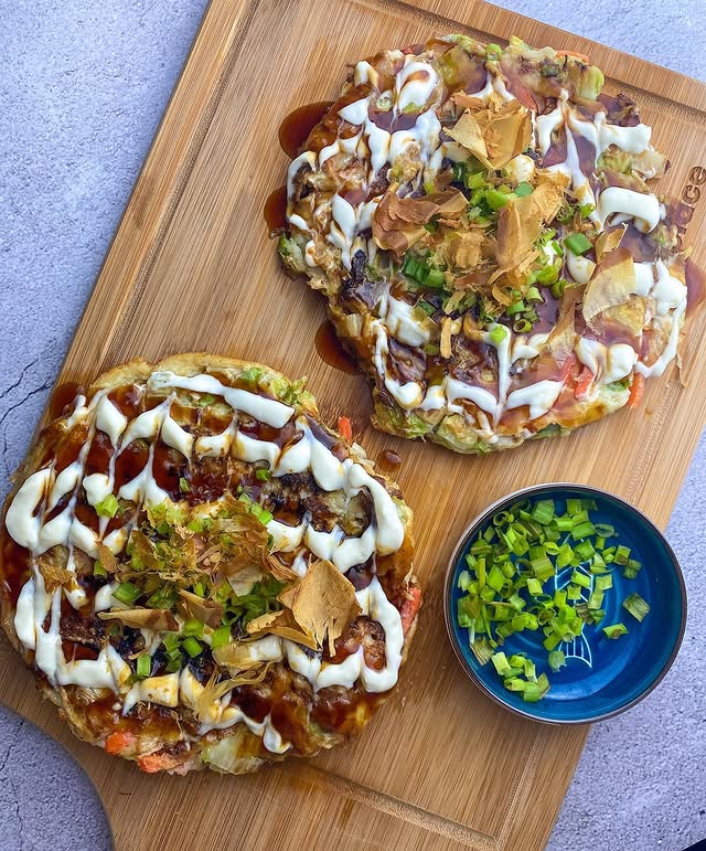 They’re cooked in a special round moulded pan and topped with takoyaki sauce, Japanese mayo, aonori (seaweed flakes), and katsuobushi (bonito flakes).