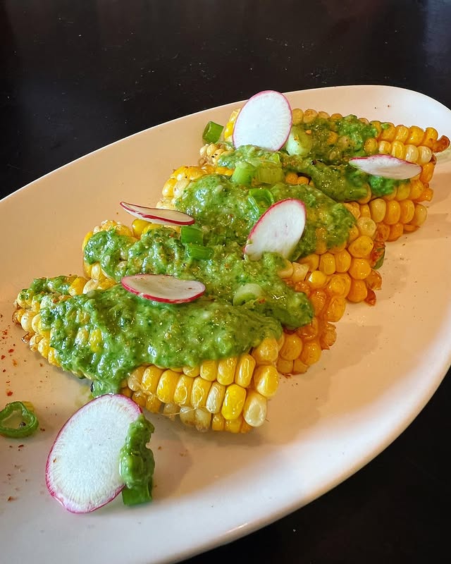 Fresh corn, soy sauce, mirin, butter. The corn is grilled on the cob over charcoal and roasted until slightly charred, giving it a smoky aroma and deep flavour.