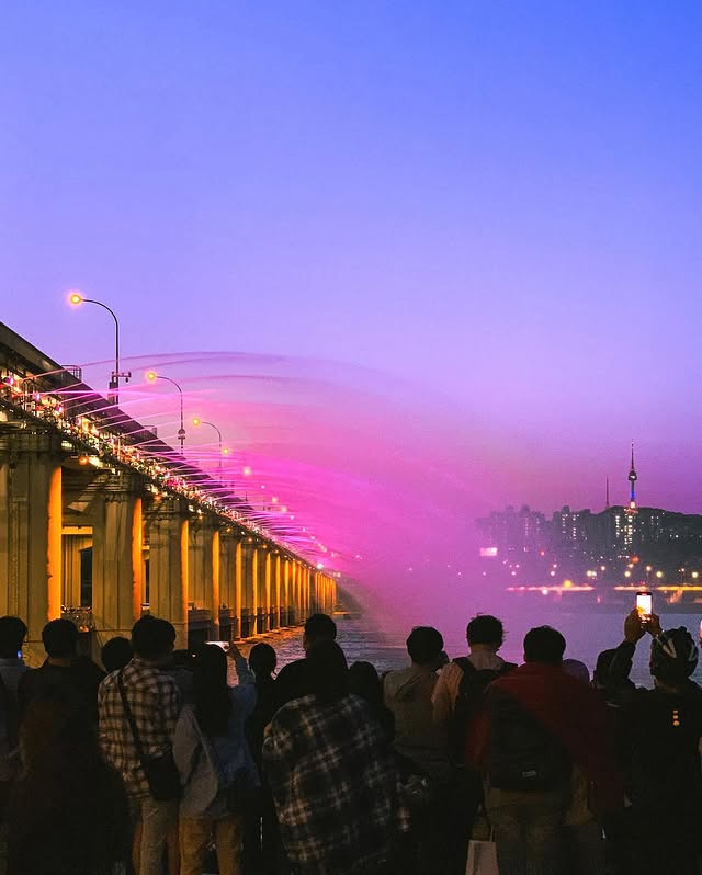 Banpo Bridge is the Guinness-certified longest bridge fountain. It features a fountain that shoots 190 tons of water per minute from 380 nozzles on both sides, creating waterfalls of light choreographed to music.