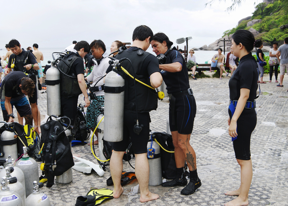 A diver needs a full set of well-maintained and properly fitted scuba gear before he can start diving. Your first dive begins from the dive spot where you’ll gear up with all the necessary equipment like scuba jackets, snorkel, fins, oxygen mask, regulators, etc.