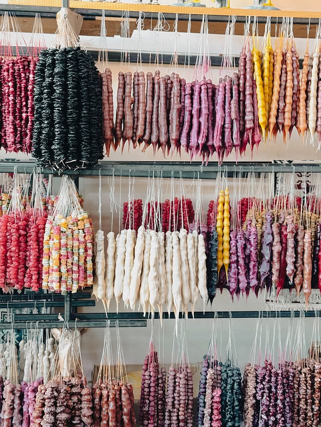 Churchkhela is one of Georgia’s most famous sweets. It’s made by threading walnuts, hazelnuts, or almonds onto a string, dipping them into thickened grape juice, and letting them dry.