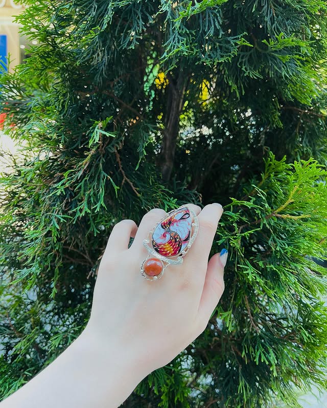 Minankari is a traditional Georgian enamel technique used on silver or gold jewellery. Pieces often feature bright colours, floral designs, or symbolic patterns, making them elegant and unique keepsakes.