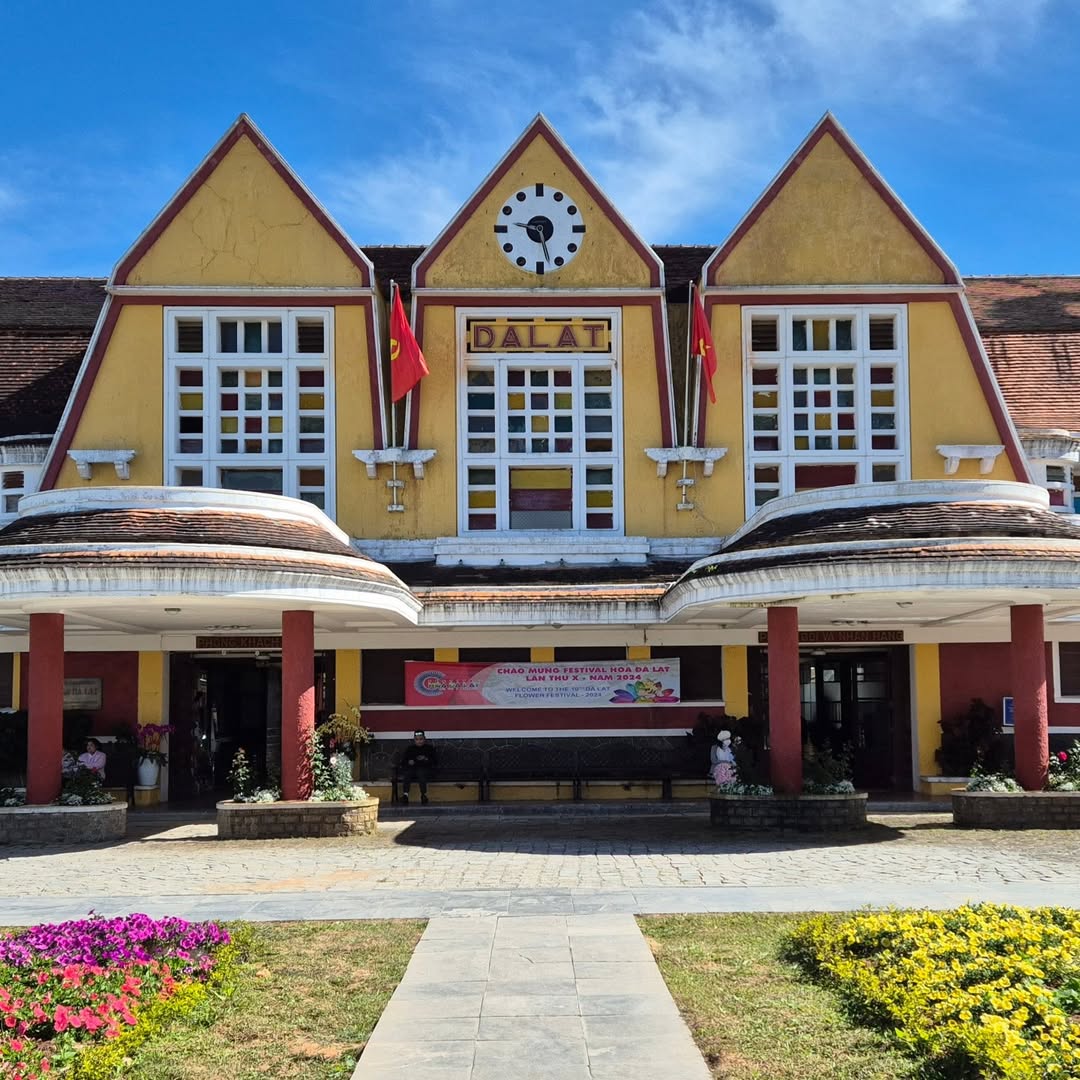 Da Lat Railway Station is located on Quang Trung Street, built between 1932 and 1938. It features an Art Deco design blended with Central Highlands communal house elements, and is highlighted by three roofs representing Langbiang Mountain.