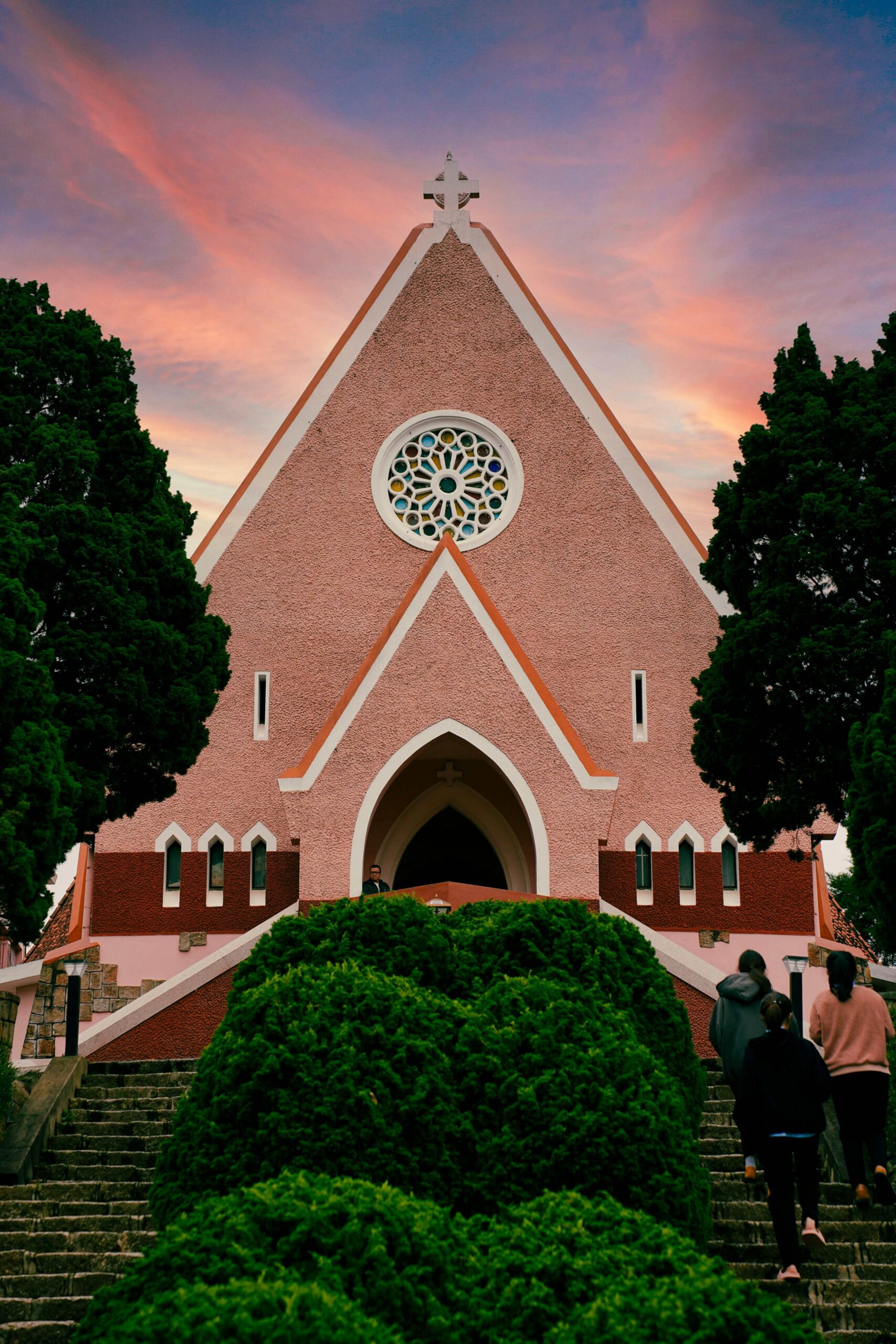 Domaine De Marie Church, built in the 1940s, is a vibrant pink Catholic church that is a popular architectural landmark in Da Lat. The structure blends classic 17th-century European style with the traditional communal-house shapes of the Central Highlands.