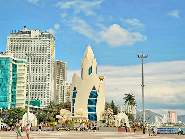 On Nha Trang beach, you can spot this giant Tram Huong Tower. It’s an architectural symbol of Nha Trang, shaped like a lotus. At night, the tower turns into an exhibition place, and it’s so magical as it lights up.