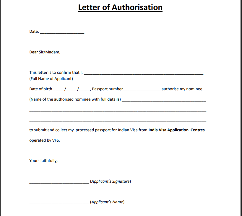 This document confirms that the individual applying for the visa has authorised the specified person to submit their documents on their behalf. You can look at the attached image to see how the letter must be written. Take a printout of the letter of authorisation if you require one.