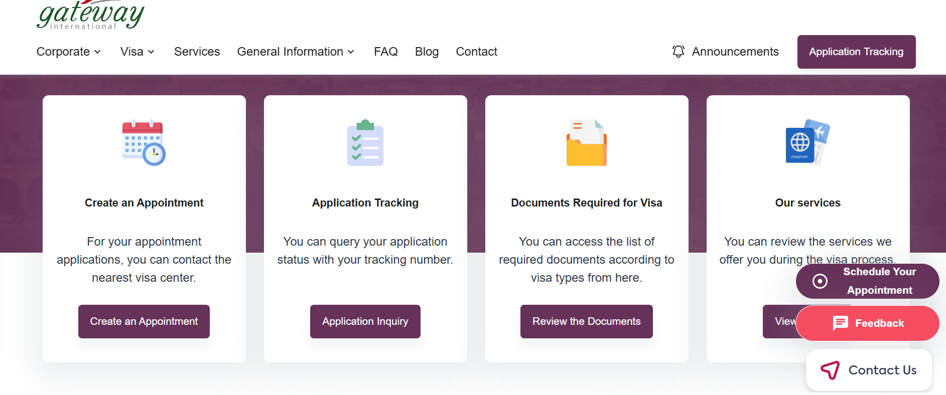 Step 3: Now, on this page, you will be shown four different options: Create an Appointment, Application Tracking, Documents Required for Visa, and Our Services.